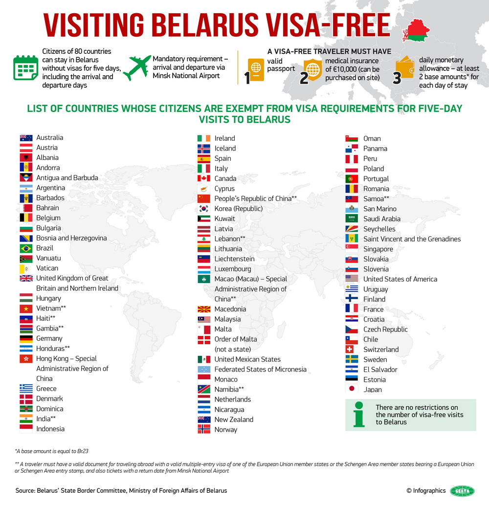 Foreign citizens of 80 countries* can enter Belarus for up to 30 days** and exit from the territory of Belarus only through the State border checkpoint of the Republic of Belarus “Minsk National Airport”.
